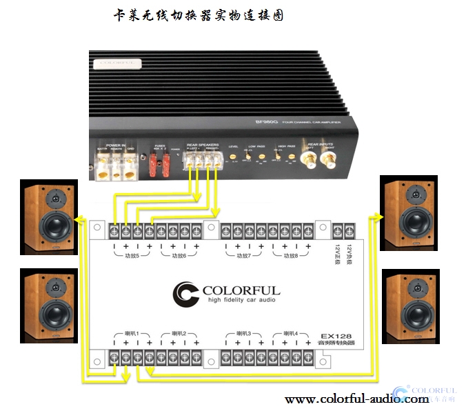 C:對比不同音頻線: 首先,所用的功放和喇叭一定要具有一定素質,功放采用四聲道,調節前后聲場一致! 把前后聲場分別輸入卡萊切換器輸入端,從具有前后聲場的主機引不同的音頻線輸入試聽功放.用此便可對比不同線材之間的差別,更讓客戶引起重視.
